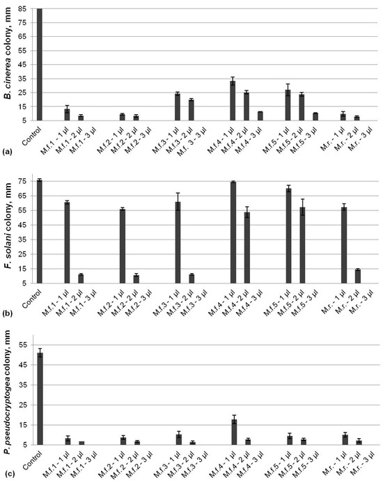 Evaluation of the antifungal activity of six EOs extracted from bee balm plants against B. cinerea, F. solani, and P. pseudocryptogea showed significant inhibition of the tested pathogens (Figure 1). All EOs led to a more than 60% reduction in B. cinerea colony size compared to the control in a dose-dependent manner (Figure 1a). The fungal growth was inhibited by about 90% by the lowest dose (1 µL) of three EOs (M.f. 1, M.f. 2, and M.r.) that were determined as the most effective against B. cinerea. The highest applied dose (3 µL) of all EOs resulted in the total inhibition of the pathogen with the exception of the oils M.f. 4 and M.f. 5, which resulted in a 90% reduction in the colony size. In contrast to B. cinerea, F. solani was less sensitive to the application of lower doses of bee balm oils and the fungal growth was reduced from 20 to 30% by the EOs M.f. 1, 2, 3, and M.r., with almost no effect by M.f. 4 and M.f. 5 (Figure 1b). However, the application of 2 µL of EOs led to a significant reduction in the colony size (about 90%) with an exception again of M.f. 4 and M.f. 5, which were less effective. A total inhibition of F. solani was achieved by using 3 µL of all tested EOs. All bee balm EOs demonstrated a high potential to inhibit the growth of oomycetes species P. pseudocryptogea at low doses (Figure 1c). The size of colonies was reduced about 85% by 1 µL of essential oils, with the exception of M.f. 4 (65%), and a total inhibition by all EOs after the application of 3 µL was observed.