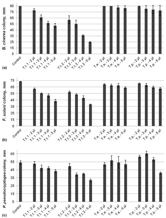Two of the tested marigold oils originating from T. tenuifolia demonstrated dose-dependent antifungal activities against all three analyzed pathogens, while the effect of the other two oils extracted from T. erecta and T. patula was not so eloquent (Figure 3). The inhibition of B. cinerea varied from 8% to 39% for the T.t. 1 EO and from 27% to 71% for the T.t. 2 EO, and the effect increased with increasing the applied dose. No significant impact on the pathogen growth by the T. erecta and T. patula oils at any of the tested concentrations was monitored (Figure 3a). There was a reduction in F. solani colonies reaching up to 41% for T.t. 1 and 48% for T.t. 2 EOs at the highest applied dose (Figure 3b). The inhibition of the fungal growth by the both EOs from T. erecta and T. patula was negligible, with a maximum of only 14% compared to the control. The inhibition of P. pseudocryptogea was up to 20% by T.t. 1 and 40% for T.t. 2 EOs, which shows the potential for more efficiency at higher doses (Figure 3c). No inhibitory effect on the oomycetes growth by the essential oil from T. erecta at the tested concentrations was observed. However, low doses of the T. patula EO led to the induction of the mycelia growth to 115%, 122%, and 107% after the application of 2, 3, and 4 µL, respectively, whereas 5 µL EOs resulted in reduction in the colony size with 24% compared to the control.