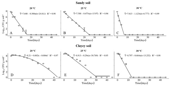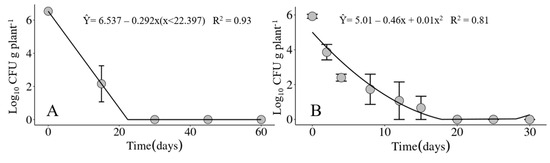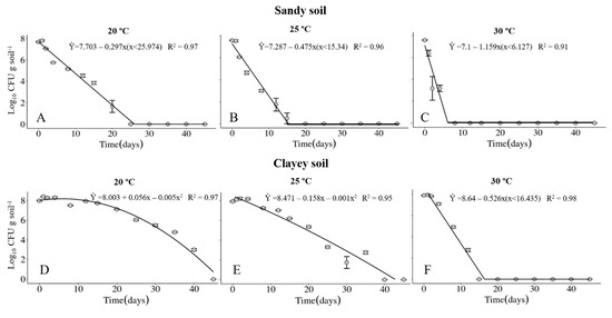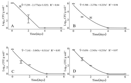 Bacterial population data were expressed in log10 UFC g soil−1 and subjected to analysis of variance (p < 0.05). The assumptions of normality of errors and homogeneity of variances were tested by the Shapiro–Wilk [27] and Levene tests [28], respectively, at 5% probability. When a significant effect was found, polynomial, linear or bisegmented regression analysis was performed using the “Segmented” package of the R software [29]. Survival analysis was also performed using the Kaplan–Meier estimator [30]. Treatments were compared using the log-rank test [31]. Analysis was carried out using the R package “Survival” [29].