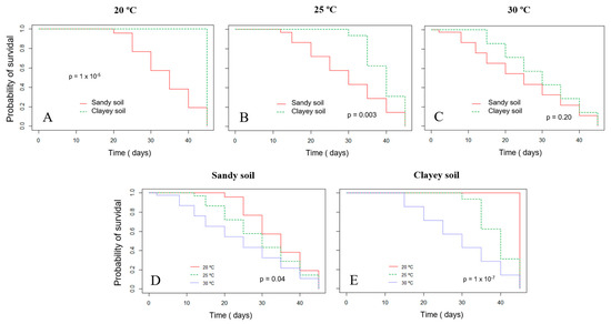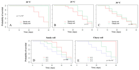 Survival probability of Xanthomonas vasicola pv. vasculorum RL1Rif+ in two types of soil under different temperatures based on the Kaplan–Meyer analysis in the second experiment. (A–C), clayey and sandy soils; (A) 20 °C; (B) 25 °C; (C) 30 °C; (D) sandy soil at different temperatures; (E) clayey soil at different temperatures. The log-rank test was used for comparisons.