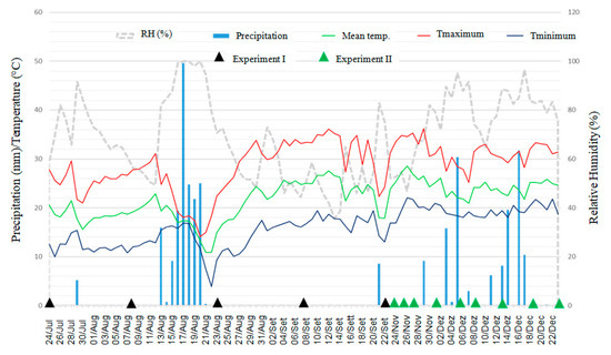 During the first 15 days after the experiment was set, accumulated precipitation ranged from 5.2 mm for the first experiment up to 60 mm for the second experiment (Figure 6). The average maximum and minimum temperatures in the first 15 days of the experiments were, respectively, 25.7 °C and 12.1 °C for the first experiment and 31.4 °C and 19.4 °C for the second experiment (Figure 6).