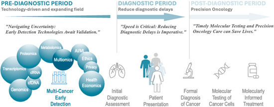 The landscape of multi-omics detection is not only in early detection or pre-diagnosis where there is both an explosion of approaches and technologies but also a whole host of challenges for integration into healthcare for screening or early biomarker detection. The diagnostic period, where a definitive answer must be reached relies on traditional and evolving technologies and establishes the gold standard. For more than two decades, precision oncology in the post-diagnostic period has relied on molecular approaches to select exact courses of therapy, and this approach is currently expanded exponentially across cancer types and medications.
