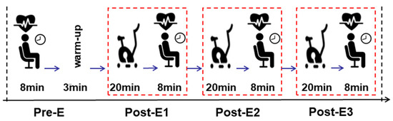 Participants then performed the cycle ergometer exercise at the same intensity level for three trials, each lasting 20 min with an 8-min break in between. HRV signals were collected immediately after each exercise trial, lasting about 8 min. Four time points were used to collect HRV signals: Pre-E, Post-E1, Post-E2, and Post-E3. Participants were instructed to remain stable, breathe naturally, and sit still to avoid motion interference with the HRV signals. The experimental protocol is illustrated in Figure 1.