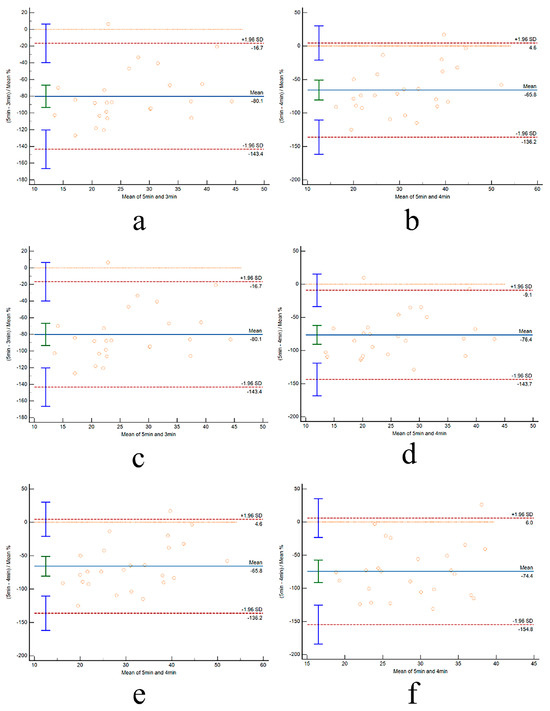Consistency for RMSSD between ultra-short duration and 5 min duration for different conditions. (a) Pre-E 3 min–5 min; (b) Pre-E 4 min–5 min; (c) Post-1 3 min–5 min; (d) Post-1 4 min–5 min; (e) Post-2 3 min–5 min; and (f) Post-2 4 min–5 min. Each circle represents one participantn’s data.