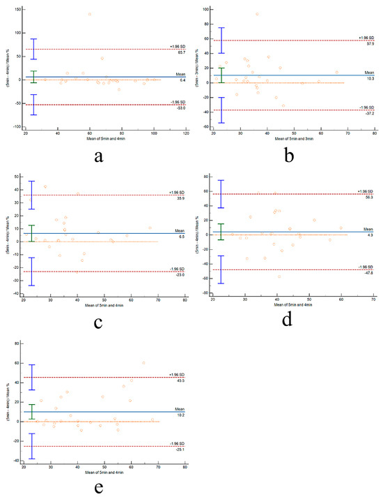 Consistency for SDNN between ultra-short duration and 5 min duration for different conditions. (a) Pre-E 4 min–5 min; (b) Post-1 3 min–5 min; (c) Post-1 4 min–5 min; (d) Post-2 3 min–5 min; and (e) Post-2 4 min–5 min. Each circle represents one participantn’s data.