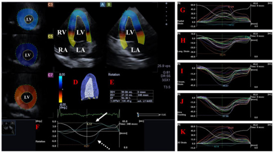 Examination of the left ventricle (LV) by three-dimensional (3D) speckle-tracking echocardiography. Following echocardiographic data acquisitions, the following typical views are created: (A) Apical 4-chamber and (B) two-chamber longitudinal views and (C3,C5,C7) cross-sectional views at apical, midventricular and basal levels, respectively. LV can be easily detected alongside other heart cavities including the left atrium (LA) and the right atrium (RA) and ventricle (RV). A number of other details were also presented including (D) 3D cast and (E) end-diastolic (EDV) and end-systolic (ESV) volumes of the LV together with ejection fraction (EF) and mass of the LV and (F) curves representing changes in volumes and strains of LV over time. (F) Apical [white arrow] and basal [white dashed arrow] LV rotations and (G) radial, (H) longitudinal, (I) circumferential, (J) area and (K) 3D strains are also demonstrated.