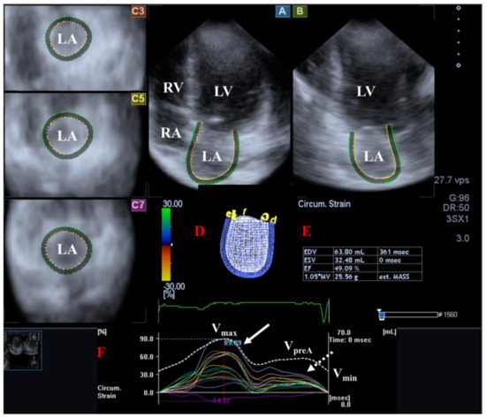 Examination of the left atrium [LA] by three-dimensional [3D] speckle-tracking echocardiography. Following echocardiographic data acquisitions, the following typical views are created: (A) Apical 4-chamber and (B) two-chamber longitudinal views and (C3,C5,C7) cross-sectional views at basal, midatrial and superior levels, respectively. LA can be easily detected alongside other heart cavities including the left ventricle [LV] and the right atrium [RA] and ventricle [RV]. A number of other details were also presented including (D) 3D cast, (E,F) maximum [Vmax], preatrial contraction [VpreA] and minimum [Vmin] volumes of the LA and curves representing changes in volumes and strains of LA over time. Reservoir [peak] and active contraction LA strains are represented by white and dashed white arrows, respectively.