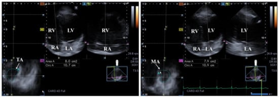 Examination of the tricuspid (TA) and mitral (MA) annuli by three-dimensional (3D) echocardiography (left panel and right panel, respectively). (A) Apical 4-chamber and (B) two-chamber longitudinal views help visualization of valvular annuli on (C7) cross-sectional view. TA and MA planes are marked by a white arrow. TA and MA can be easily detected alongside the heart chambers including the left ventricle (LV) and atrium (LA) and the right ventricle (RV) and atrium (RA).