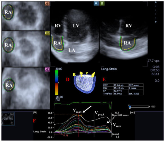 Examination of the right atrium (RA) by three-dimensional (3D) speckle-tracking echocardiography. Following echocardiographic data acquisitions, the following typical views are created: (A) Apical 4-chamber and (B) two-chamber longitudinal views and (C3,C5,C7) cross-sectional views at basal, midatrial and superior levels, respectively. RA can be easily detected alongside other heart cavities including the left ventricle (LV) and atrium (LA) and the right ventricle (RV). A number of other details were also presented including (D) 3D cast and (E,F) maximum (Vmax), preatrial contraction (VpreA) and minimum (Vmin) volumes of the RA and curves representing changes in volumes and strains of _RA over time. Reservoir (peak) and active contraction RA strains are represented by white and dashed white arrows, respectively.