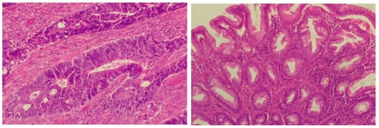 Adenocarcinoma showing moderately differentiated glands filled with necrotic debris. HE stain, 400× magnification (left); hyperplastic polyp with “sawtooth” appearance, mild nuclear enlargement and no horizontal crypts, HE stain, 200× magnification (right).