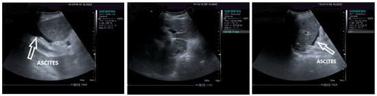The pulsed Doppler ultrasound revealed a patency of the main portal vein as well as of the left and right portal branches and decreased, demodulated hepatopetal portal venous flow, with mildly decreased respiratory variability in the amplitude of the portal vein flow. The Dopler aspects of the liver and spleen are illustrated in Figure 4.
