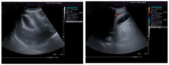 Thickening of gallbladder wall: 2D aspect (left); color Doppler aspect (right).