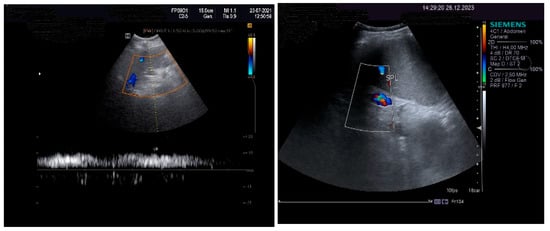 Doppler examination. Liver: pulsed Doppler of the portal vein (left). Spleen: color Doppler of splenic vein (right).