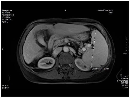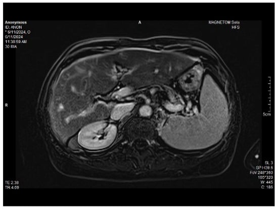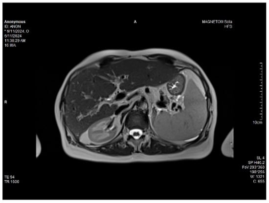 Abdominal MRI study confirmed the hepato-splenomegaly, ascites and the patency of the portal vein system. In addition, small veno-portal shunts were highlighted at the periphery of both hepatic lobes. Various MRI features are depicted in Figure 6, Figure 7, Figure 8 and Figure 9.