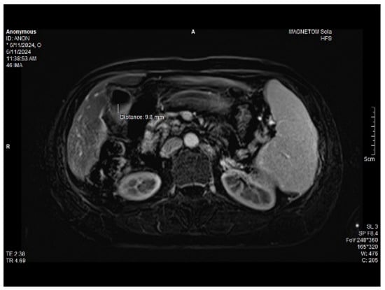 The measurements of the resistivity index of the hepatic artery at the liver hilum revealed increased values (HARI = 0.79). However, the liver elastography demonstrated a low stiffness. The measurements were made using the acoustic radiation force impulse (ARF)I method, by point shear wave (p SWE) elastography, and the obtained median value was 1.24 m/s, IQR = 0.12, equivalent to an F2 Metavir fibrosis score. Therefore, the diagnosis of liver cirrhosis was highly improbable. The elastography of the right liver lobe performed by the ARFI method, pSWE, is presented in Figure 5.