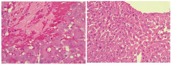 Liver swing areas with congestion, hemorrhagic necrosis, isolated atrophy of hepatocytes and occlusion of terminal hepatic venule, HE stain, 400× magnification (left); liver showing markedly dilated sinusoids and central vein, HE stain, 200× magnification (right).