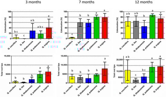 - Andrés-Alpuente, A.; Sánchez, S.; Martín, M.; Aguirre, Á.J.; Barriuso, J.J. Comparative analysis of different methods for evaluating quality of Quercus ilex seedlings inoculated with Tuber melanosporum. Mycorrhiza 2014, 24, 29–37. [Google Scholar] [CrossRef] [PubMed]