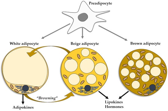 The adipocytes found in the WAT can be mainly regarded as energy accumulators. However, the brown adipocytes of the BAT act as a heat source. A third type of adipocytes, named beige adipocytes, have the same origin as white adipocytes, but present the functional phenotype of brown cells []. Under certain conditions, mature white fat cells trans-differentiate into beige adipocytes, a process referred to as WAT browning, which entails the appearance of beige cells in WAT depots, more so in subcutaneous than in visceral WAT [] (Figure 1). As mentioned, the phenomenon of WAT browning may occur in various conditions, including exercise [], prolonged cold exposure [], and exposure to capsaicin, resveratrol, fish oil, cinnamon, short fatty acids [], and PPAR gamma agonists []. The browning of WAT may be considered as an environmental adaptation mechanism in adult life, similarly to the presence of brown adipocytes produced during intrauterine life []. Resembling brown adipocytes, beige adipocytes contain multilocular lipid droplets [] and are rich in mitochondria, expressing uncoupling protein-1, a thermogenic protein []. Beige adipocytes secrete minute amounts of leptin and adiponectin, pertaining to the overall small mass of cells []. They are mainly heat producers, but also contribute to the improvement of glucose and lipid metabolisms and mounting evidence supports the thesis of beige adipocytes as protectors against obesity and insulin resistance. Similarly to BAT, beige tissue is considered as a therapeutic target for metabolic diseases, including obesity []. The reverse is also true, as in aging, obesity, and metabolic disorders the capacity of the WAT cells to induce browning of WAT is decreased [] (Figure 1).