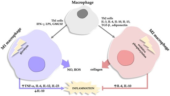 Another distinction between the two main types of macrophages is in ATP generation; M1 macrophages generate ATP quickly via the glycolysis pathway, while M2 macrophages use oxidative phosphorylation (OX PHOX) to obtain energy []. In lean mice, macrophages have low OX PHOX expression and a limited capacity for glycolysis; conversely, in obese mice, both types of pathways are overexpressed and highly effective []. Moreover, M1 macrophages produce lipids and pro-inflammatory lipid mediators while M2 macrophages contribute to lipid oxidation []. In activated M1 macrophages, eicosanoids are not the only pro-inflammatory components released; the synthesis of pro-inflammatory CKs such as TNF-α, IL-6, IL-12, and IL-23 is also increased, with a concomitant decrease in the anti-inflammatory CKs, such as IL-10 [].