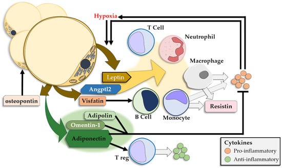 The WAT releases a large number of adipokines that either show anti-inflammatory effects or promote inflammation, and releases insulin resistance-inducing CKs [,] (Figure 3). Leptin and adiponectin are the most prominent adipokines and show significantly different plasmatic concentrations in obese individuals, with high levels of leptin and low levels of adiponectin [,]. Other adipokines modulate the signaling pathways in the AT as well as the cellular and CK interplay in local and systemic inflammation.
