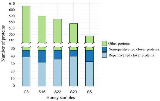 - Individual honey samples contained repetitive proteins common to all samples studied. Our data show that more repetitive red clover proteins were identified in each honey sample compared to some proteins that were not repeated in honey samples. The common number of proteins found in all honey samples was 39.6% of the total number of proteins found in each honey sample.