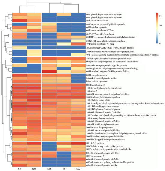 The highest frequency of occurrence was found for 19 red clover proteins in all honey samples studied. It was found that not every red clover protein was repeated in the individual honey tested. Proteins that are present only in honey samples S22, C3, and S23 are NADH-dependent glutamate synthase, plasma membrane ATPase, zinc finger C3HC4 type protein (RING finger) protein, and bifunctional polymyxin resistance protein ArnA, indicated by the yellow color in the heatmap. The relative composition of these non-repetitive proteins was the lowest compared to the other proteins present in the five honey samples studied, at 20.0%. Among six identified ribosomal proteins, three were identified in all samples, while a 40S s16-like ribosomal protein was present in all sample except S5. The other ribosomal proteins, 40S ribosomal protein s9-2-like (Fragment) and 40S ribosomal protein sa-like (Fragment), were not present in two honey samples, specifically S5 and S15, and the sequence coverage for the latter ribosomal proteins was low—7.41 and 12.50% (Table 1).