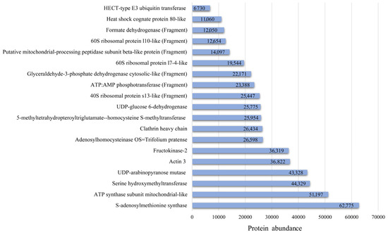 The mitochondrial-like UDP-arabinopyranose mutase, actin 3, and ATP synthase subunit proteins had highest sequence coverage, 38.81%, 37.67%, and 33.33%, compared to all identified proteins in this study. A total of 19 red clover proteins were common to all tested honey samples of different botanical origin and comprised 39.6% of the total red clover proteins identified (Figure 3). The relative abundance of these 19 proteins ranged from 6730 to 62,775.1, with HECT-type E3 ubiquitin transferase being the lowest and S-adenosylmethionine synthase the highest.