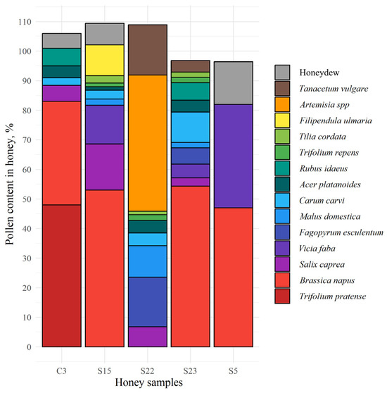 Botanical origin of five honey samples of Lithuanian origin, based on the pollen content, where C3: monofloral red clover honey; S5, S15, S22: monofloral rapeseed honey; S22: polyfloral honey.