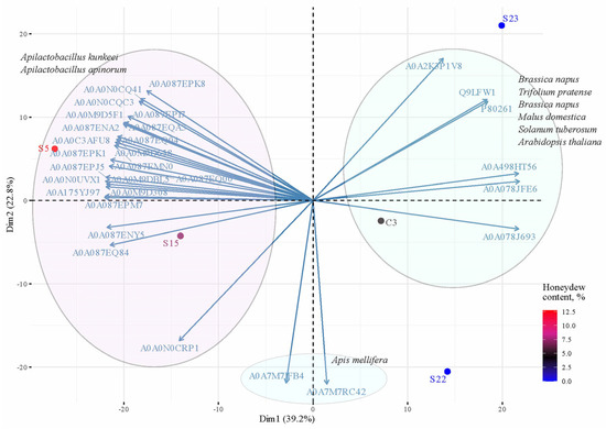 We identified proteins associated with Apilactobacillus kunkeei and Apilactobacillus apinorum in five honey samples studied; the number of proteins related to these bacteria prevailed in the range of 87–105 and 23–36, respectively (Table 3). The total numbers of these proteins present in all honey samples are 146 and 471, representing 16.1% and 5.0% of all proteins found in the samples. Proteins specific for bees (Apis mellifera) account for 10.3%, while other different LABs account for less than 1.0%. The total percentage of proteins associated with plants in honey samples is 58.84%. The same honey samples contained microbiota including aphis (Acyrthosiphon pisum), Aphis craccivora, and Aphis glycines, all LAB taken together, as well endosymbionts, and their numbers accounted for 41.07%. These data indicate that the number of plant proteins exceeds the microbiota present in the honey samples.