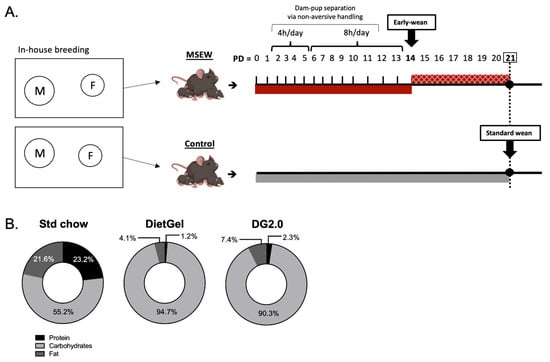 The maternal separation started on PD2 by removing the dam from her pups in the home cage using non-aversive handling into a clean cage with ad libitum access to food and water. Figure 1A shows the separation schedule utilized in this study with dam-pup separation lasting for 4 h during PDs 2–5 and 8 h during PDs 6–13. During the separation period, pups remained together with littermates in the home cage, which was well-ventilated and kept over a heating pad to assist with thermoregulation by maintaining a constant cage temperature (32–34 °C). Dams had ad libitum access to food and water. The dam and pups were kept in separate rooms to prevent vocalization effects. At the end of the separation period, the dam was returned to the home cage with her pups. The tunnel transfer method is a non-aversive handling technique proven to reduce unintended stress effects associated with conventional tail handling [39,40,41]. The tunnel transfer method was used exclusively to handle mice during the scheduled dam-pup separation portion of our MSEW protocol (Figure 1A). Early weaning occurred on PD14 by relocating all pups of a given litter into a clean cage, away from the dam. MSEW pups of a given litter were kept together during the early wean window (PDs 14–21) and fed one of the following non-milk diets: (1) PicoLab® 5058 pellets (Standard (Std) chow) moistened with reverse-osmosis-purified tap water, (2) Clear H2O® DietGel® Recovery (DietGel), (3) a combination of DietGel (1 gel cup) with standard chow (18–19 g), or the (4) reformulated Clear H2O® DietGel® Recovery (DG2.0). During this study, the manufacturer of DietGel® released a reformulated version of DietGel® Recovery to replace the original version of this product. To distinguish between these two formulations of the DietGel® Recovery product, we refer to them here as DietGel (original formulation of DietGel® Recovery; no longer available for purchase) and DG2.0 (reformulated DietGel® Recovery; at the time of manuscript submission, this product formulation is available for purchase on the Clear H2O® manufacturer website). The non-milk diets utilized in this study were selected based on the widespread use of Clear H2O® products to support animals in research, DLAM staff recommendations, and the type of “standard chow” used in our animal housing facility (PicoLab® 5058). Macronutrient information for the non-milk diets included in this study was obtained from the respective manufacturer and is displayed as percentages for macronutrient comparison in Figure 1B. Non-milk diets were monitored and refreshed every 2–3 days. Litters sized n = 1–4 received one DietGel or DG2.0 cup every 2–3 days while litters n > 4 received two DietGel or DG2.0 cups every 2–3 days. Old gel remnants were removed from the cage prior to replenishing with fresh DietGel or DG2.0. The combination of DietGel with standard chow (DietGel + chow) was prepared by inserting standard chow pellets into the DietGel gel cup formulation, thereby reducing spatial cognition or discriminatory selection between the diet sources. Control pups were naturally reared by dams under the described animal housing conditions and weaned on the PD21 standard wean date. Animals were euthanized at PD21 for tissue collection. The body weights of all pups were assessed on PD21.