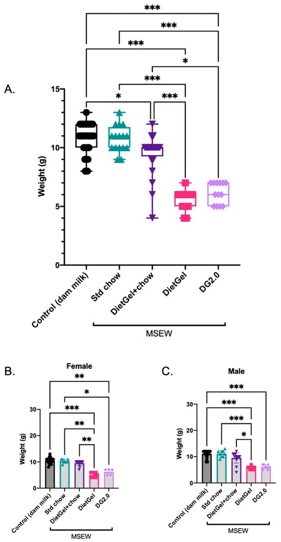 Body weight comparisons of mice based on PD14–21 diet for (A) combined sexes (Control n = 42; MSEW DietGel n = 24; MSEW Std chow n = 16; MSEW DietGel + chow n = 28; MSEW DG2.0 n = 13). Dam milk is the control diet. Box extends from 25th to 75th percentiles. Line in the middle represents the median. Whiskers extend to minimum and maximum values. Sex-based body weight comparisons for (B) females (Control n = 20, MSEW DietGel n = 9, MSEW Std chow n = 7, MSEW DietGel + chow n = 13, MSEW DG2.0 n = 5), and (C) males (Control n = 22, MSEW DietGel n = 15, MSEW Std chow n = 9, MSEW DietGel + chow n = 15, MSEW DG2.0 n = 8). Mice aged PD21. Error bars on bar graphs represent mean ± SD. Asterisks denote significance according to Kruskal–Wallis test (A–C) with Dunn’s post-hoc (A) at p < 0.001 (***), p < 0.01 (**), p < 0.05 (*).