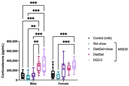 Serum corticosterone measured at PD21 (Control: n = 18 male, n = 24 female; MSEW DietGel: n = 14 male, n = 8 female; MSEW Std chow: n = 9 male, n = 7 female; MSEW DietGel + chow: n = 14 male, n = 15 female; MSEW DG2.0: n = 20 male, n = 17 female). Outliers were identified in the corticosterone raw dataset with Grubb’s test and removed prior to generating figures and applying the indicated tests to assess statistical significance. Error bars represent mean ± SD. Asterisks denote significance according to two-way ANOVA with Tukey’s post-hoc at p < 0.001 (***), p < 0.01 (**).