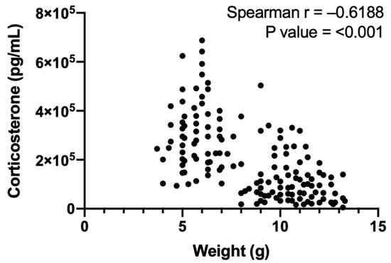 All figures and analyses were completed using GraphPad Prism 9 software. Statistical analyses were performed as described in figure legends using an alpha-level criterion of 0.05 for statistical significance. Results and error bars represent mean ± SD with *** <0.001, ** <0.01, * <0.05. Two-way ANOVA was used to analyze the effects of early wean diet, sex, and their interaction (two-factor analysis). Significant two-way ANOVAs were followed by Tukey’s post-hoc multiple comparisons to detect differences between individual groups. The Kruskal–Wallis test followed by Dunn’s post-hoc was used to analyze the effect of an early wean diet on the dependent variable (one-factor analysis). Pilot studies revealed significant inter-animal variation in the serum corticosterone data within experimental groups. Tukey’s box-plot method (1.5 times interquartile range (IQR)) was used to flag the presence of potential outliers in the raw dataset. Grubb’s test was used to detect and identify the outliers for removal. Outliers were removed from the corticosterone dataset prior to generating figures and two-way ANOVAs (a total of three outliers were identified and removed from groups DietGel male, DietGel female, and DietGel + chow male). The normal distribution of data was assessed using tests of normality and lognormality in GraphPad Prism 9 software. Where applicable, the Kruskall–Wallis one-way ANOVA was utilized as a non-parametric analysis of variance. The nonparametric Spearman correlation was used to examine the relationship between weight and corticosterone at a 95% confidence interval and two-tailed p-value (see Table S1 for complete Spearman rank correlation test statistics).