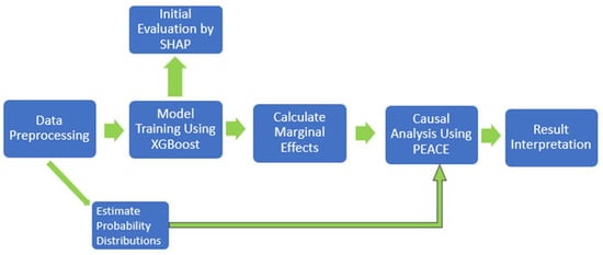 We used eXtreme Gradient Boosting (XGBoost) [18] for learning purposes, analysis libraries such as SHapley Additive exPlanations (SHAP) [23], and causal inference functions such as marginal effect and causal inference libraries such as Double ML and our Probabilistic Easy Variational Causal Effect (PEACE).