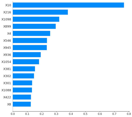 In Figure 2, the SHAP values represent the average impact of each feature on the model’s output magnitude. The feature X10 which corresponds to the column named ‘original_shape_Sphericity’ in the dataset, showed the highest impact, with a mean SHAP value close to 0.8, indicating a large influence on the model output. This is followed by features X216, X1098, and X899, each displaying values slightly below 0.5. The rest of the features have SHAP values below 0.3, suggesting comparatively lower influences on the model output.