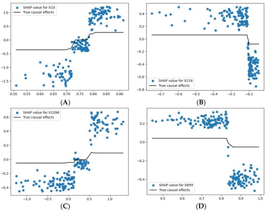In Figure 3A, the SHAP values for feature X10 exhibited a sharp increase between the values of 0.80 and 0.85, as shown in the scatter plot. The SHAP values were relatively lower and more varied when X10 was below this threshold. The black line represents the true causal effects, which showed a sudden step up at around 0.85, indicating a threshold effect where X10 significantly influenced the model’s output after this point.