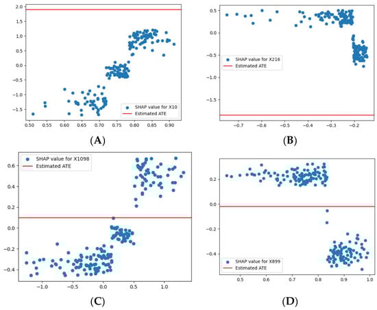 (A) Represents SHAP values versus estimated Average Treatment Effect (ATE) value for feature X10, (B) Represents SHAP values versus estimated ATE value for feature X216, (C) Represents SHAP values versus estimated ATE value for feature X1098, (D) Represents SHAP values versus estimated ATE value for feature X899.
