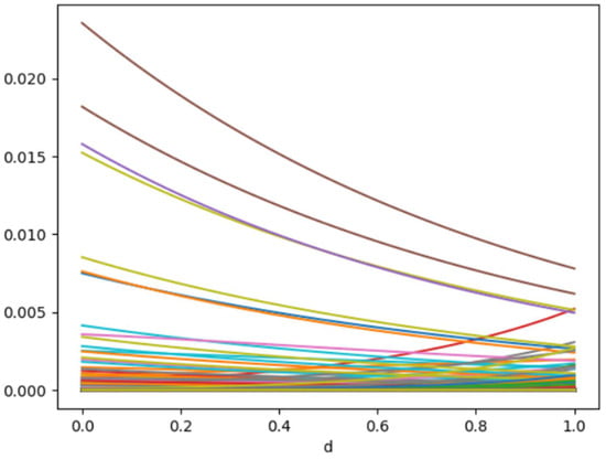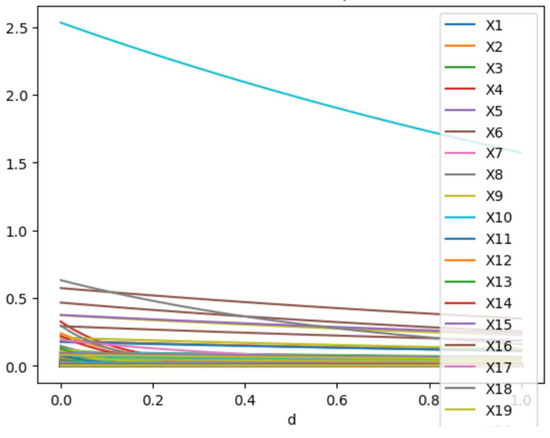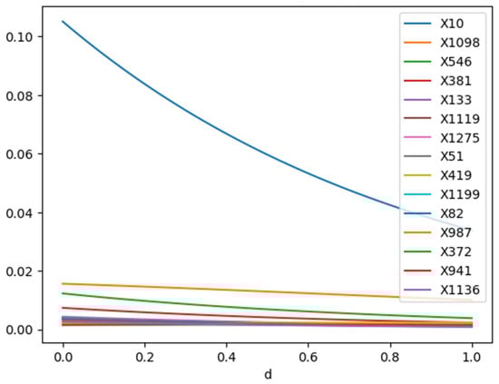 Figure 5 shows the top 15 mean PEACE values where X10 (the blue line) corresponds to ‘original_shape_Sphericity’ in the dataset; it had the highest values compared to other variables. The other fourteen values were very small compared to X10. In Figure 5, for all features, as d increased from 0 to 1, the mean positive PEACE values decreased. This indicates that the causal effects corresponding to more probable regions were not significantly greater than those in other regions.