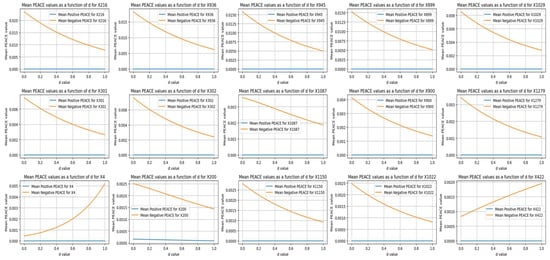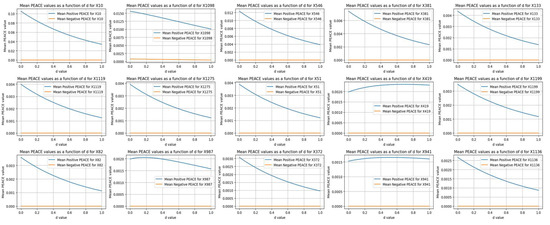 Figure 8 compares the top mean positive PEACE values with their corresponding mean negative PEACE values for the features in the dataset. Each subplot illustrates how the positive (blue lines) and negative (orange lines) PEACE values of a specific feature changed as a function of the degree d from 0 to 1.