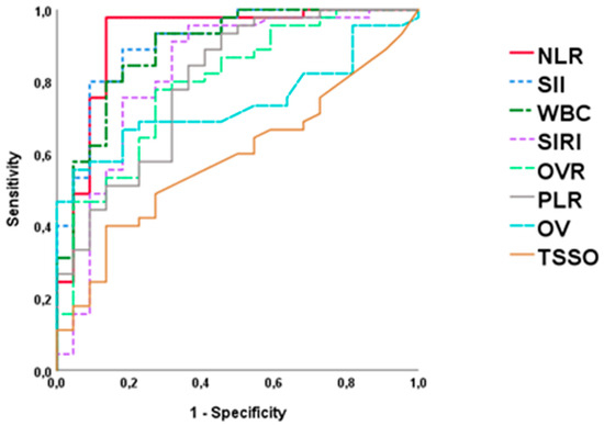 Finally, the statistically significant quantitative variables in the univariate analysis were represented by ROC curves (Figure 1, Table 4). NLR was the parameter with the highest AUC (0.918), followed by SII (0.895), WBC (0.874), and SIRI (0.824). The cut-off point of NLR = 2.57 was the one with the highest sensitivity (92.4%) and specificity (90.1%).
