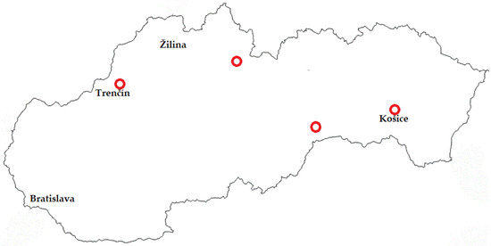 Map of Slovakia with places (red circles), where all samples were taken for the study.