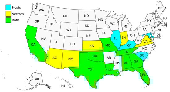 States of US with T. cruzi DTUs genotyped in mammalian hosts (blue), triatomine vectors (yellow) or both (green). In the case of the state of Missouri (MO), Curtis-Robles et al. [] reported a triatomine (Triatoma sanguisuga) resulted positive by PCR for T. cruzi DNA, but it was not possible to type the DTU. The outline map was taken from https://simplemaps.com/resources/svg-maps, accessed on 20 June 2024. AL, Alabama; AK, Alaska; AZ, Arizona; AR, Arkansas; CA, California; CO, Colorado; CT, Connecticut; DE, Delaware; FL, Florida; GA, Georgia; HI, Hawaii; ID, Idaho; IL, Illinois; IN, Indiana; IA, Iowa; KS, Kansas; KY, Kentucky; LA, Louisiana; ME, Maine; MD, Maryland; MA, Massachusetts; MI, Michigan; MN, Minnesota; MS, Mississippi; MO, Missouri; MT, Montana; NE, Nebraska; NV, Nevada; NH, New Hampshire; NJ, New Jersey; NM, New Mexico; NY, New York; NC, North Carolina; ND, North Dakota; OH, Ohio; OK, Oklahoma; OR, Oregon; PA, Pennsylvania; RI, Rhode Island; SC, South Carolina; SD, South Dakota; TN, Tennessee; TX, Texas; UT, Utah; VT, Vermont; VA, Virginia; WA, Washington; WI, Wisconsin; WY, Wyoming.