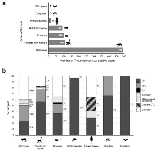 DTUs reported in mammals according to host species and the state of localization are summarized in Table A1. The states with more positive T. cruzi cases among mammals were Texas (408) and Louisiana (250) (Figure 2a). The molecular prevalence in mammalian hosts was 12.3%, excluding studies based on preselected samples [,,]. Most of the samples positive by T. cruzi were obtained from Carnivora (60.6%; 494/815) and particularly from domestic dogs (206/494) (Figure 3). DTUs could not be typed for all samples positive for the presence of T. cruzi DNA. The typing success rate was 66.9% (545/815) with the highest number of uncharacterized samples from carnivores (41.1%; 203/494). In the case of humans, all positive isolates were from autochthonous US cases of T. cruzi infection, and the 70.6% (12/17) were characterized from whole blood []. There is no information about the sample source for the remaining five isolates [].