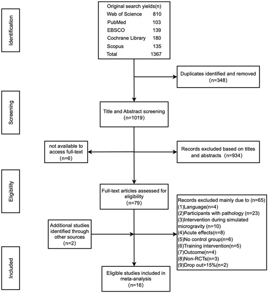 A search of electronic databases, along with scanning the reference lists, yielded 1367 relevant studies. After removing duplicates, 1019 titles and abstracts were screened. From these, 934 records were excluded based on their titles and abstracts, and 6 records were excluded due to the unavailability of full text. This led to the selection of 79 studies, which were then carefully screened for eligibility. During this process, two additional records were identified through meticulous examination of reference lists and citations of pertinent articles. A total of 65 studies were excluded for the following reasons: (1) 3 studies were published in German and 1 study was published in Korean; (2) the participants in 23 studies had diseases or were injured; (3) 10 studies performed interventions during simulated microgravity; (4) 8 studies focused on acute effects; (5) 6 studies did not have a control group; (6) the control group in 5 studies did not use free weights or weight stack training as the intervention; (7) the outcome measures in 4 studies did not include maximal strength and power; (8) 3 studies were not RCT designs; and (9) the dropout rate was greater than 15% in 2 studies. Ultimately, 16 studies met the inclusion criteria and were included in the meta-analysis. The detailed flowchart in Figure 1 illustrates the systematic selection process of the studies.