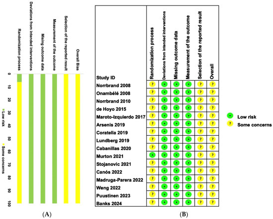 Assessing the risk of bias was conducted using a revised version of the Cochrane Risk of Bias (RoB 2) tool, evaluating individual studies across six different domains of bias (Figure 2A). Only one study [45] reported randomization sequence generation. All sixteen studies included in the meta-analysis were rated as having “some concerns” for risk of bias (Figure 2B), likely because it is impossible to blind subjects to experimental and control groups in studies of this nature. Nevertheless, it is important to acknowledge that blinding participants is a notably challenging criterion to meet in this context. Adding to the credibility of these assessments, the studies demonstrated significantly high inter-rater reliability (ICC = 0.95).