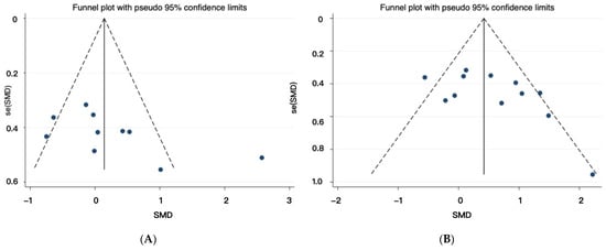 Funnel plot illustrating the symmetrical distribution of the effects across the included studies. (A) Funnel plot for studies about maximal muscle strength. (B) Funnel plot for studies about muscle power.