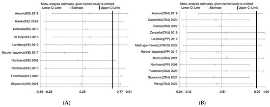 Sensitivity analysis for this meta-analysis [35,36,37,38,39,40,41,42,43,44,45,46,47,48,49,50]. (A) Sensitivity analysis for studies about maximal muscle strength. (B) Sensitivity analysis for studies about muscle power.