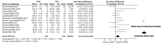 A total of twelve reports were included in the meta-analysis. The data presented in Figure 5 reveal significant differences between FWT and TRT in improving the muscle power of healthy subjects (ES = 0.47; 95% CI: 0.10–0.84, p = 0.01). However, our analysis detected moderate statistical heterogeneity (I2 = 54%).