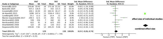 Ten of the included reports examined the effects of FWT versus TRT on maximal muscle strength, with measures encompassing 1 RM, peak torque, and maximal voluntary contraction. The analysis (Figure 6) revealed no significant differences in outcomes between the two training modalities (ES = 0.24; 95% CI: −0.26–0.74, p = 0.35), although a high degree of heterogeneity was observed (I2 = 74%).