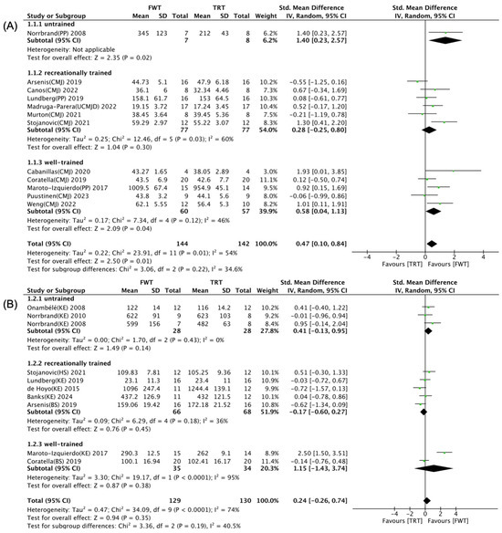 Forest plot with subgroup analysis of strength training experience [35,36,37,38,39,40,41,42,43,44,45,46,47,48,49,50]. (A) Effect of strength training experience on muscle power. (B) Effect of strength training experience on maximal muscle strength.